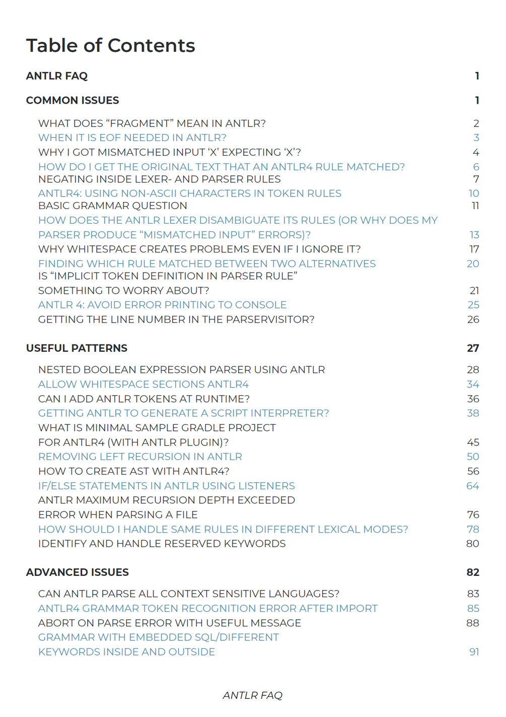 It contains a curated list of the most common questions about ANTLR and a cheatsheet containing a reference for rules and commands in ANTLR.